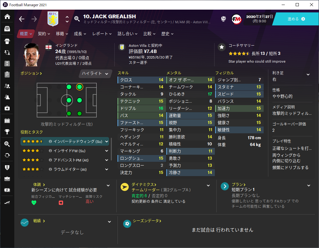 今回のプレイガイドはアストン・ヴィラです。基本的にはプレミアリーグの下位にいて、たまに2部に落ちている気がするクラブですが、意外とディフェンスも含めて視野が高い選手が多いクラブです。そんなわけで、バルセロナで使った戦術をアストン・ヴィラでも使えるのではないかと思ったので、挑戦をしてみました。