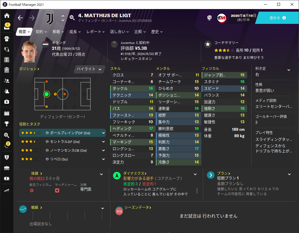 ディフェンダーとしてはポジショニングと予測力が非常に高く、守備時の位置取りが完璧といった感じ。更に気になるのがパスと視野が17と、センターバックとしては異常に高いこと。もはやFootball Managerの既存のセンターバックの役割にはおさまらず、プレイメイカーを冠する役割を作っても良い気がする。