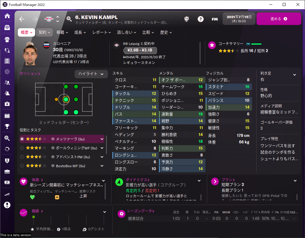 チームワーク、運動量、積極性、スタミナが高くて献身的に走り回る選手。さらにスピード、加速力、敏捷性があって足が速かったり、オフザボールが高くて攻撃時の位置取りも良かったりと、走りに関係する能力は全般的に高い。他にもドリブルが上手かったり、視野とパスがあってパスも上手かったりと攻撃面では非常に万能で、2,3列目ならどこでもできるポリバレントさもあったりと凄い選手。