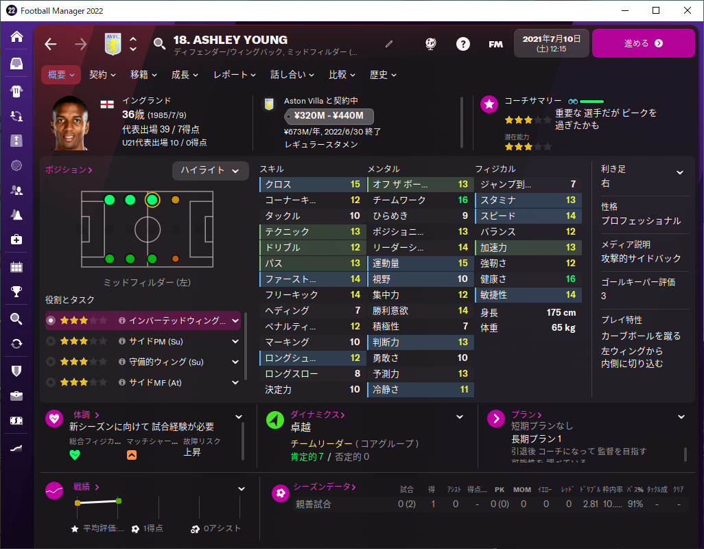 クロスが優れていて、他の能力は全般的に13,14前後とそこそこ良い水準にあって、なんでもそこそここなせる選手。