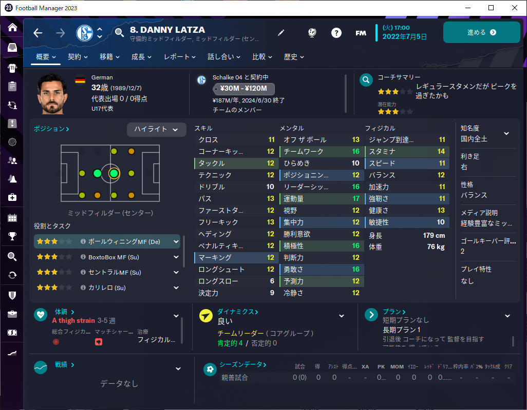 セントラルMFと守備的MFをメインにセンターバックもできる選手。チームワーク、運動量、スタミナが高くて献身的に走り回るタイプ。守備とビルドアップはそこそこで悪くなく、攻撃は最低限な感じか。