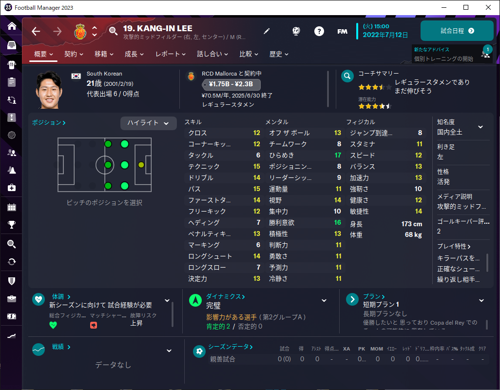 ここでは選手を1人しか紹介しないが、中盤やFWでウイングもできる選手がいるので枚数的な心配はいらないと思う。一方で、ウイングしかできない選手がいないので、ウイングを使わない戦術を使うことができる。