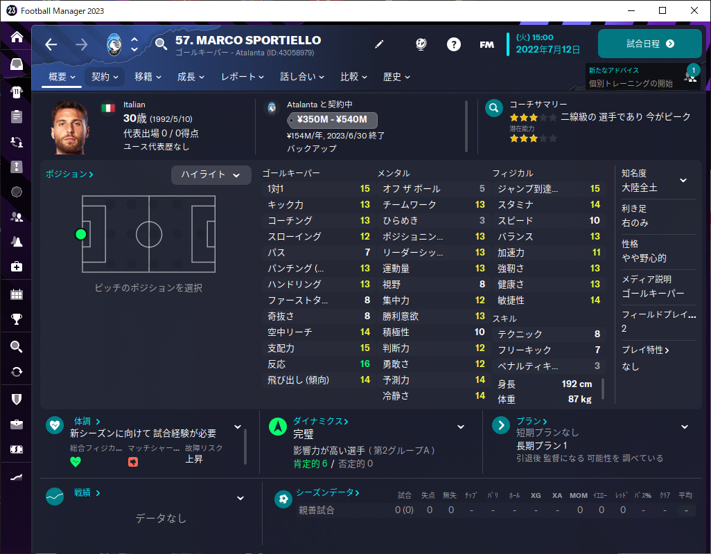 スピードと加速力が高くて足が速く、強靭さが高くてフィジカルコンタクトが強かったりと、身体能力が高いサイドバック。ジャンプ到達点なども悪くないので、センターバックにコンバートをしても良いかも。チームワーク、運動量、勝利意欲、積極性、スタミナが高くて、試合を通してピッチ上を広く献身的に走り回る。