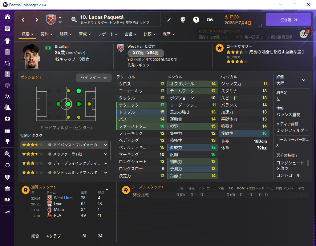 身体能力が非常に高い。FM24はそこが大事な気がするので、こんな感じでも活躍できそう(適当)